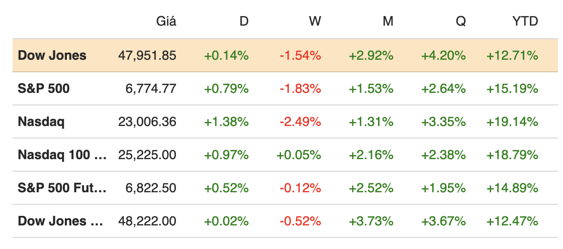 Khép phiên ngày 18/12, chỉ số S&P 500 tăng 0,79%, chốt phiên tại 6,774.77 điểm. Nasdaq Composite tăng 1.38% lên 23,006.36 điểm, trong khi Dow Jones Industrial Average nhích 65.88 điểm, tương đương 0.14%, đóng cửa ở mức 47,951.85 điểm.