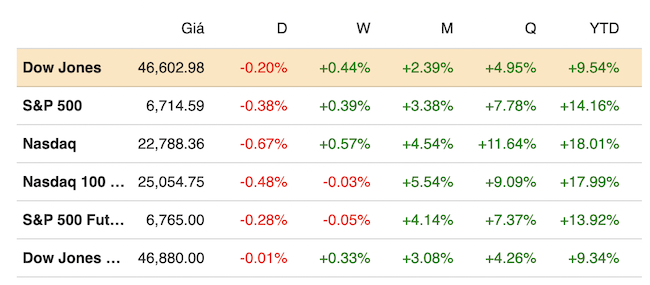 Kết thúc phiên giao dịch ngày 07/10, chỉ số S&P 500 lùi 0.38% xuống 6,714.59 điểm, đứt mạch 7 phiên tăng liên tiếp. Chỉ số Nasdaq Composite mất 0.67% còn 22,788.36 điểm. Chỉ số Dow Jones giảm 91.99 điểm (tương đương 0.2%) xuống 46,602.98 điểm.
