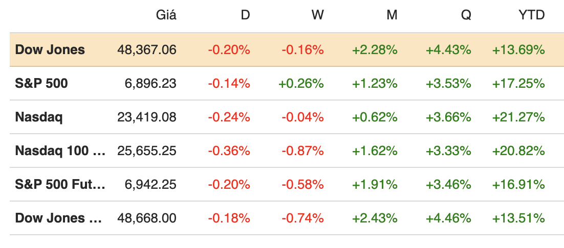 Khép phiên ngày 30/12, S&P 500 mất 0.14%, đóng cửa tại 6,896.24 điểm. Nasdaq Composite giảm 0.24% xuống 23,419.08 điểm, trong khi Dow Jones Industrial Average lùi 94.87 điểm, tương đương 0.20%, kết phiên ở 48,367.06 điểm.