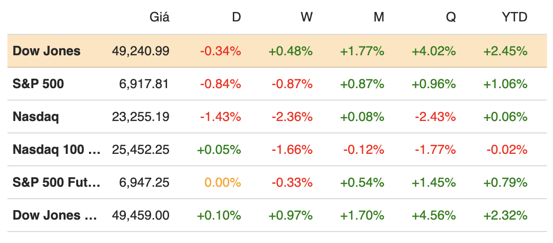 Khép phiên ngày 04/02, chỉ số S&P 500 giảm 0.51%, đóng cửa ở 6,882.72 điểm. Ngược lại, Dow Jones tăng 260.31 điểm, tương đương 0.53%, lên 49,501.30 điểm. Nasdaq Composite giảm mạnh hơn, mất 1.51% xuống 22,904.58 điểm. Tâm lý né rủi ro còn gia tăng khi Bitcoin giảm hơn 3%, sau khi có thời điểm rơi xuống dưới mốc 73,000 USD.
