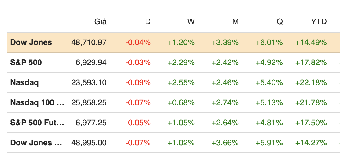Khép phiên ngày 26/12, chỉ số S&P 500 giảm nhẹ 0.03%, chốt phiên ở mức 6,929.94 điểm. Nasdaq Composite giảm 0.09%, đóng cửa tại 23,593.10 điểm. Chỉ số Dow Jones Industrial Average mất 20.19 điểm, tương đương 0.04%, xuống còn 48,710.7 điểm.