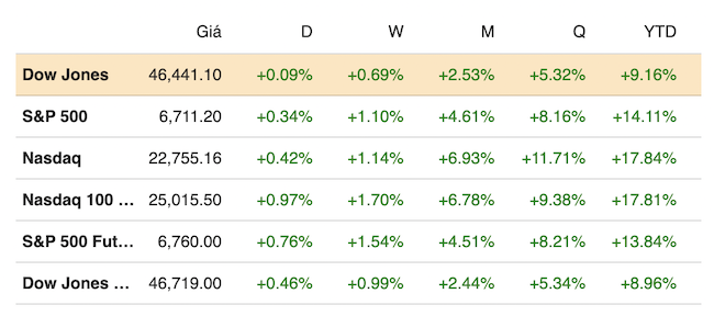 Kết thúc phiên giao dịch ngày 01/10, chỉ số S&P 500 tiến 0.34% lên 6,711.20 điểm. Trước đó, chỉ số này đã đạt mức cao mọi thời đại mới trong phiên. Chỉ số Nasdaq Composite cộng 0.42% lên 22,755.16 điểm, còn chỉ số Dow Jones nhích 43.21 điểm (tương đương 0.09%) lên 46,441.10 điểm.