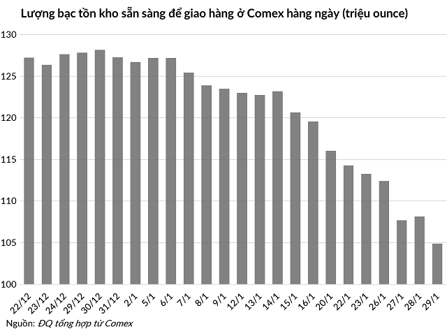 Dữ liệu của sàn Comex cho thấy trong tháng 1/2026, lượng tồn kho đã giảm 43.5 triệu ounce (gần 1.4 ngàn tấn), tương đương với 10% số bạc hồi đầu năm. Riêng lượng bạc đã đăng ký (registered) – tức là có thể được dùng để giao cho người mua – giảm gần 18% trong tháng 1, xuống còn chưa đầy 105 triệu ounce.
