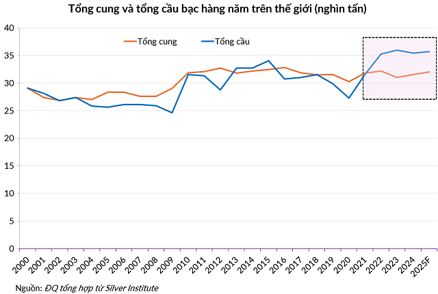 Thế giới đang tiêu thụ bạc nhanh hơn rất nhiều so với khả năng khai thác, cung đã không đáp ứng đủ nhu cầu trong 5 năm liên tiếp. Theo dữ liệu từ Silver Institute, mức thâm hụt lũy kế từ năm 2021 đến 2025 là gần 800 triệu ounce (khoảng 25 ngàn tấn). Để bù đắp cho sự thiếu hụt này, thế giới đã phải rút dần từ các kho dự trữ trên mặt đất.