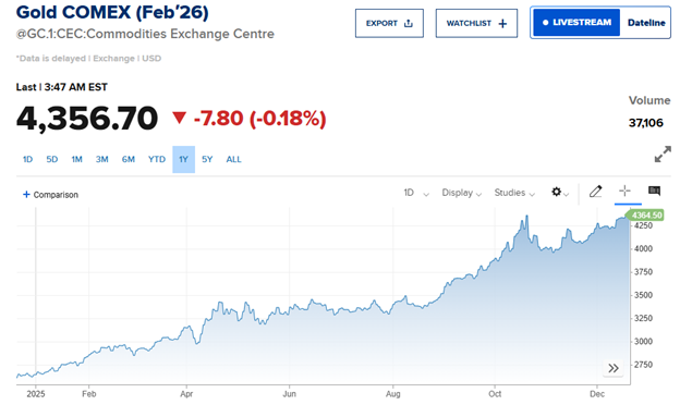Vàng cũng không kém cạnh khi lần đầu vượt mốc 4,350 USD, đánh dấu mức tăng hơn 64% so với đầu năm.