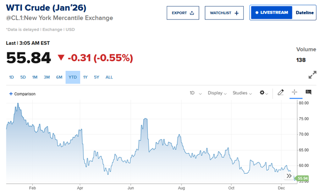 Một hàng hóa khác cũng giảm mạnh trong năm nay là giá dầu thô. Tính tới ngày 19/12, hợp đồng dầu WTI tương lai về 56 USD/thùng, giảm gần 22% so với đầu năm 2025 và gần mức đáy 4 năm.