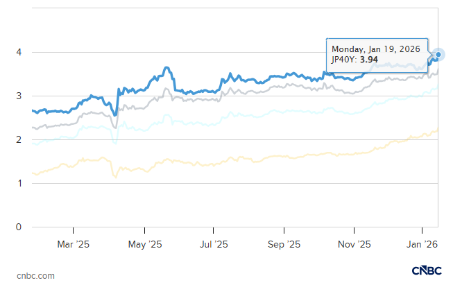 Lợi suất trái phiếu chính phủ Nhật Bản (JGB) kỳ hạn 40 năm đã tăng lên mức cao kỷ lục 4% trong phiên giao dịch ngày 20/01, khi thị trường chứng kiến làn sóng bán tháo diện rộng do nhà đầu tư lo ngại các đề xuất cắt giảm thuế bán hàng đối với thực phẩm có thể làm xấu đi tình hình tài khóa của nước này.