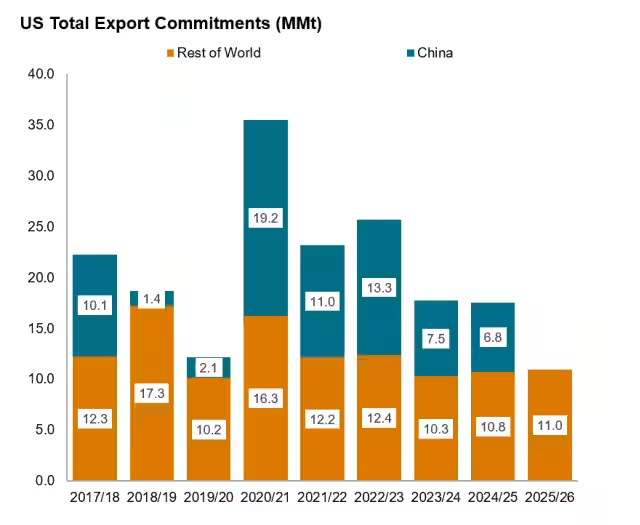 Từ đầu năm đến nay, Trung Quốc chưa mua bất kỳ tấn đậu nành nào từ Mỹ cho năm 2025-26, theo dữ liệu từ Bộ Nông nghiệp Mỹ.