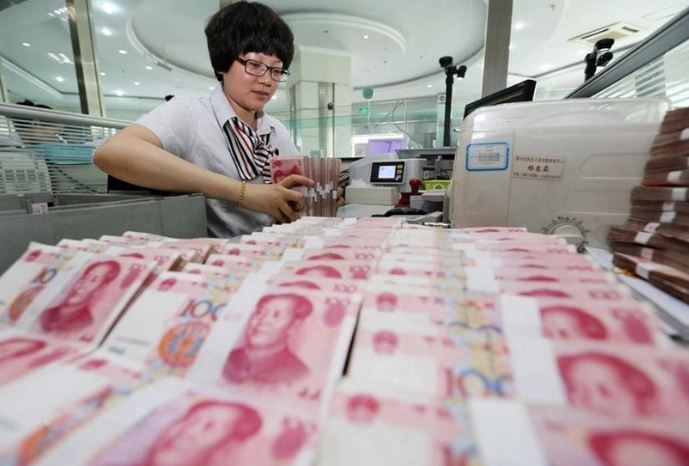 Nhân viên kiểm đồng nhân dân tệ tại ngân hàng ở Giang Tô, Trung Quốc. (Nguồn: THX/TTXVN)