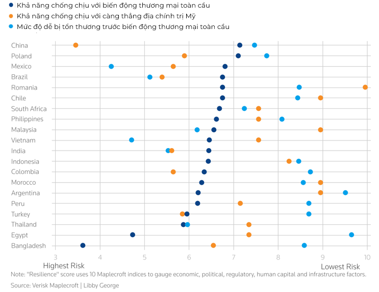 Bằng cách phân tích 20 thị trường mới nổi lớn nhất với các thông số từ mức nợ đến sự phụ thuộc vào doanh thu xuất khẩu, các nhà nghiên cứu đã đánh giá khả năng các quốc gia này ứng phó với biến động thương mại và sự thay đổi nhanh chóng của các liên minh địa chính trị.